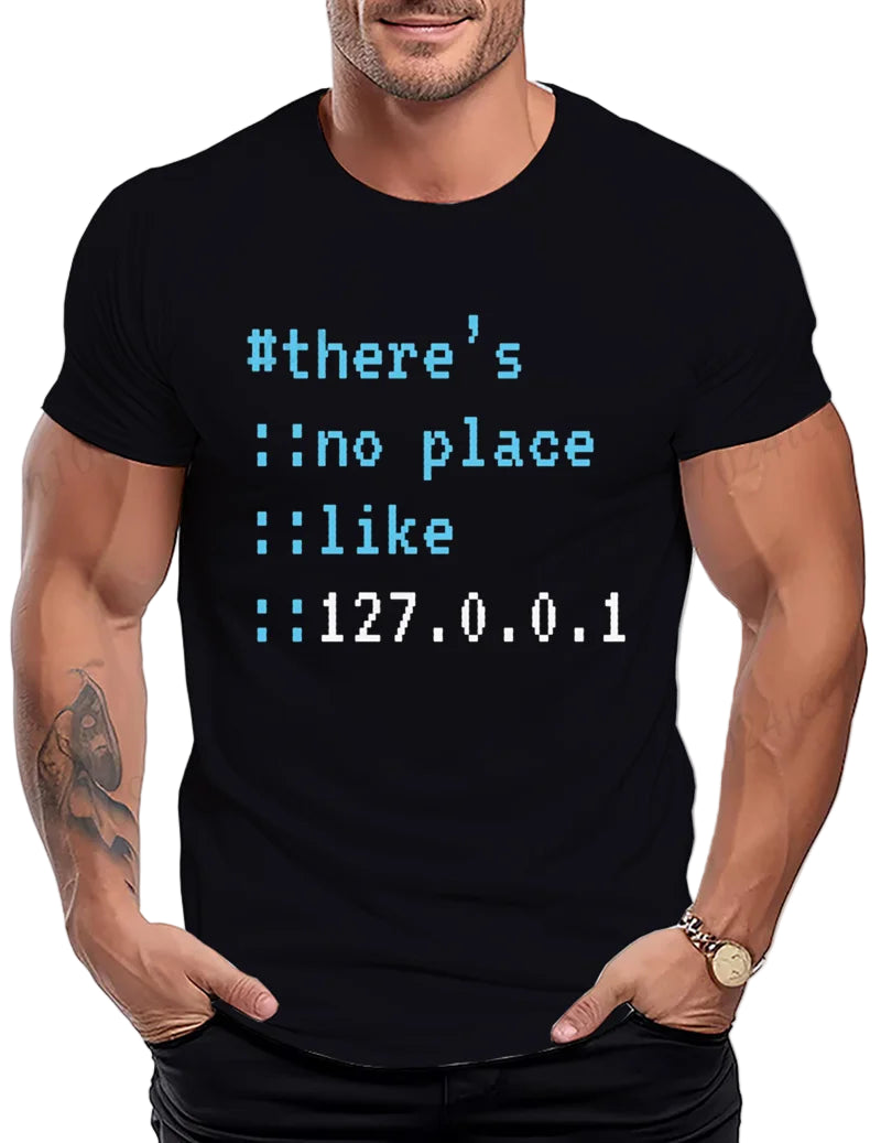 חולצת גיקים מושלמת עם כיתוב סופר חכם ומעוצב בסגנון שורת קוד:#there's ::no place ::like ::127.0.0.1